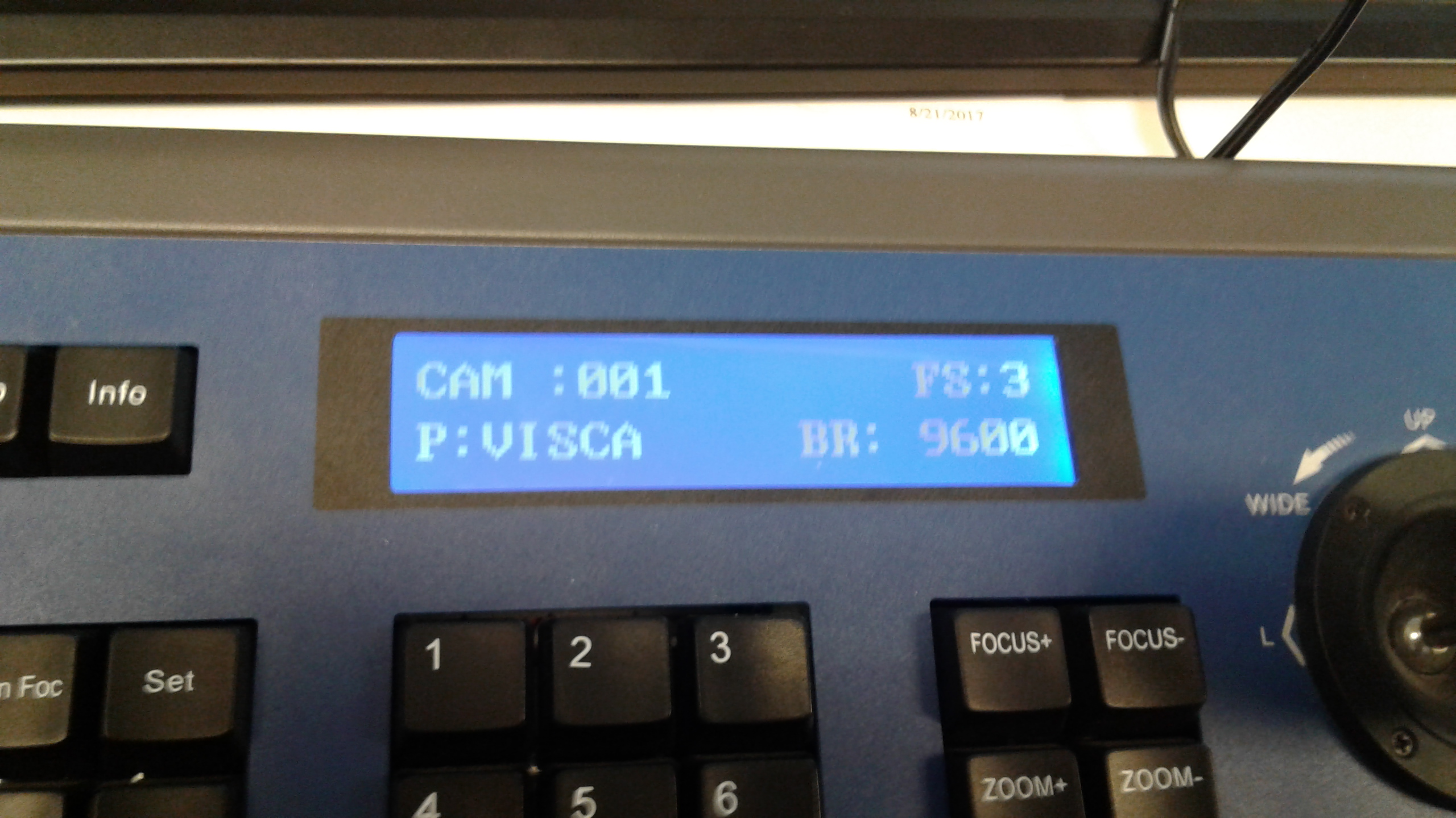 - The picture below shows the settings of the joystick on camera 1. The picture shows the joystick is using the VISCA protocol for control at a baud rate of 9600.