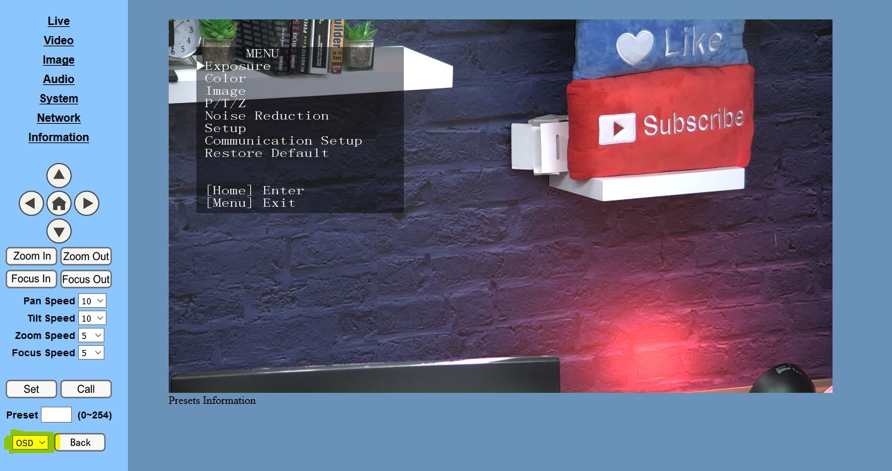 If you do not have the IR remote around or not at all you can access the OSD on the IP interface as seen below.